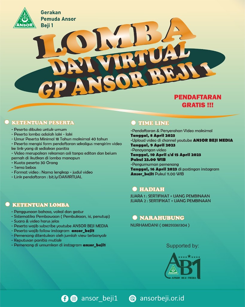 Purwokerto – Hari Lahir (Harlah) Nahdlatul Ulama (NU) akan diperingati pada 28 & 31 Januari 2024. Tahun ini merupakan Harlah ke-101 NU, sejak berdirinya pada 16 Rajab 1344 Hijriah atau 31 Januari 1926 Masehi. Untuk memperingati Hari Lahir Nahdlatul Ulama yang ke 101, NU BEJI 1 mengadakan rangkaian kegiatan diantaranya sebagai berikut: Lomba : (28 … Baca Selengkapnya